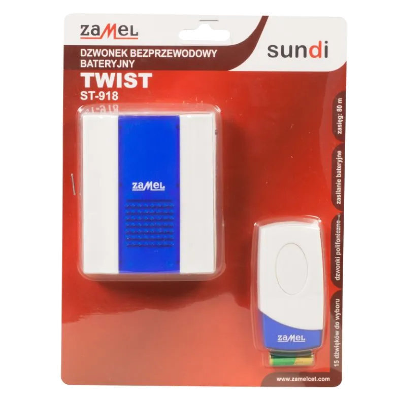 Dzwonek bezprzewodowy TWIST Zamel ST-918 to funkcjonalne rozwiązanie o zasięgu do 80 m i głośności 80 dB. Oferuje 15 polifonicznych melodii do wyboru i działa na zasilaniu bateryjnym – idealny do domu lub biura.