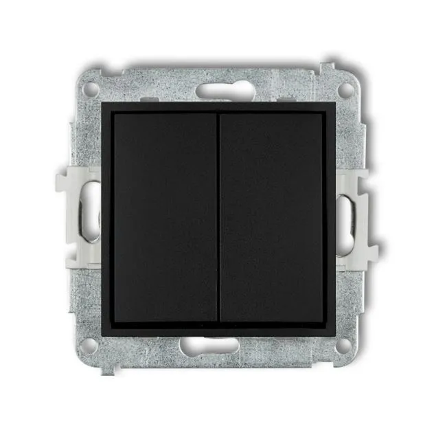 Zaawansowany łącznik krzyżowy podwójny Karlik Mini Dwa klawisze bez piktogramów, elegancki czarny mat i maksymalna funkcjonalność. Idealny do sterowania oświetleniem z wielu miejsc.