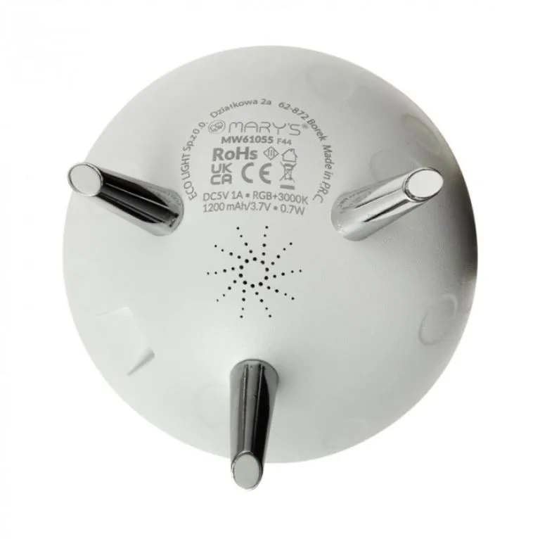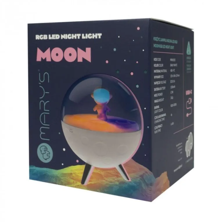 Magiczna lampka nocna LED RGB „Księżyc” MARY’S to przyjazne dzieciom, bezpieczne i nastrojowe oświetlenie, które rozświetla wnętrze ciepłą bielą 3000K lub kolorami RGB. Dzięki akumulatorowi 1200 mAh świeci nawet do 40 godzin, a ładowanie USB trwa tylko 4 h. Idealna do pokoju dziecka, sypialni, salonu i jako prezent.