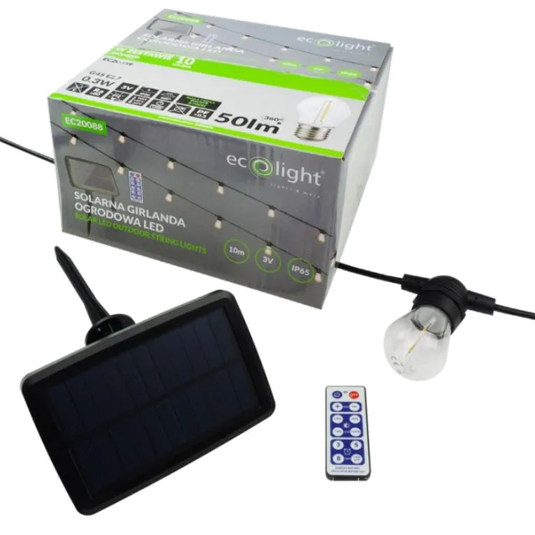 Solarna girlanda LED 10m EC20088 to ekologiczne i stylowe oświetlenie ogrodowe z 10 żarówkami G45 o ciepłej barwie 2700K. Dzięki panelowi solarnemu oraz możliwości ładowania micro USB, zapewnia niezawodne działanie nawet w mniej słoneczne dni.